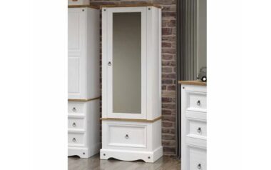 Part of our Edwardian White Range. Features a 1 drawer, 1 door design that is manufactured from Solid Pine in a white wash effect and also completed with a beautiful white washed wax finish, internal hanging and mirrored door. This Armoire offers a medium storage solution for your home and