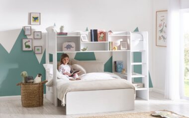 The Oreo Triple Bunk is available in a modern Anthracite or White finish. The Oreo combines style with great practicality and includes a handy pull-out drawer and extensive shelving for kids’ books and toys, with a subtle raised lip to prevent anything slipping down the back. Sleeping up to 3