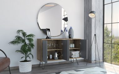 Finished in a luxurious hard wearing melamine with a bleached oak effect with grey legs Grey doors with push open fittings Fully assembled Dimensions: W117 X D38.6 X H75 Cms You can choose your delivery date and time slot at check out.