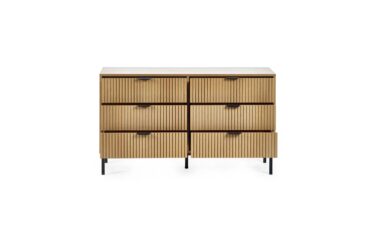 Experience effortless organisation with the Cian 6 Drawer Chest, your stylish solution for clutter-free living. This elegant chest features six spacious drawers, offering ample room for all your essentials- from clothing to linens and beyond. The eye-catching slatted effect front panels create a modern look, while the warm wood finish