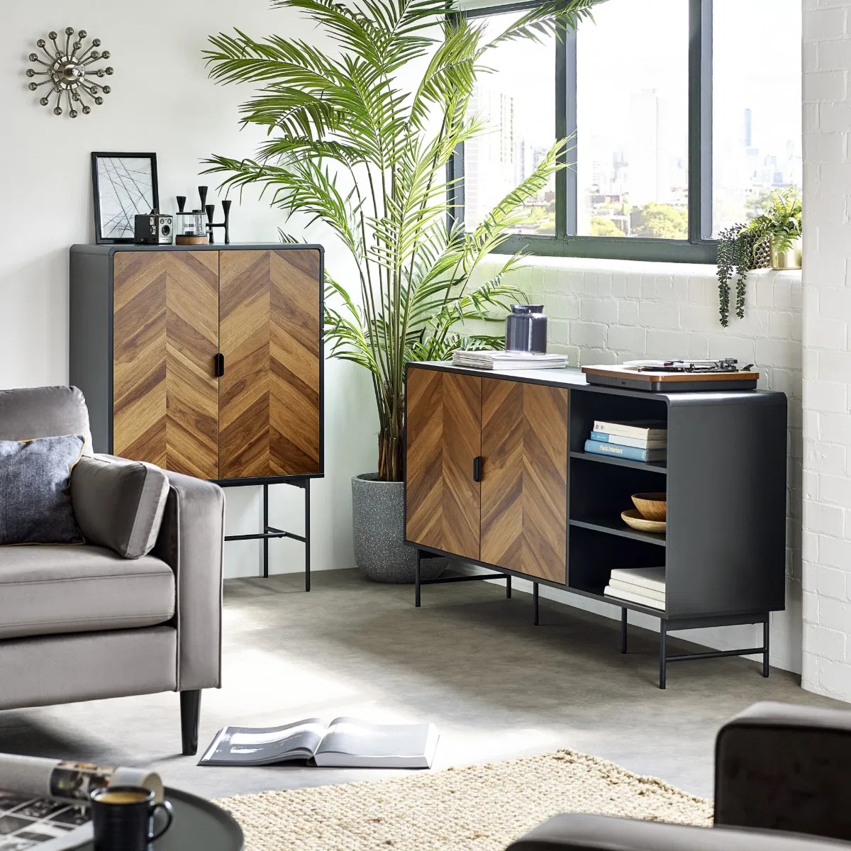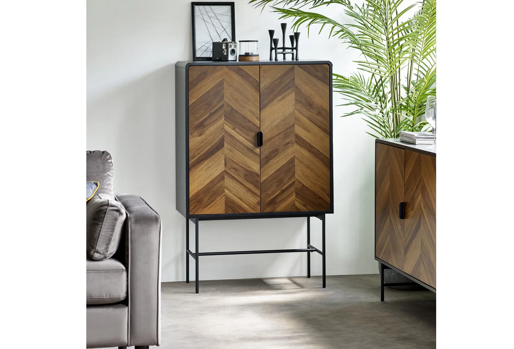 Add a stylish touch to your home with this contemporary storage cabinet that perfectly blends design and function. Featuring bold chevron wood-effect doors framed by smooth black edges and sleek black edge handles, it brings subtle texture and refined detail to your space. Gently curved edges give it a softer, modern look. Behind the two doors, a fixed shelf offers plenty of room to organise books, dining essentials, or everyday items with ease. Supported by slim black metal legs, it delivers a lightweight feel that complements both modern and industrial interiors.