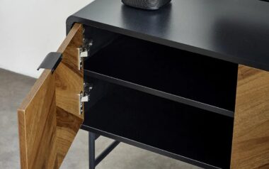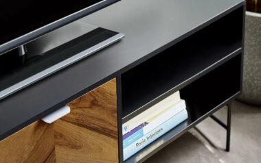 - Create a sleek and functional focal point in your living room with this TV unit. Featuring bold chevron warm wood-effect doors framed by smooth curved edges and finished with sleek black edge handles, it offers subtle style and refined detail. Two open shelves provide easy access for media devices or decorative items, while two doors open to reveal shelves inside, offering generous hidden storage. Designed to fit TVs up to 65 inches, itās supported by slim black metal legs for a lightweight feel with an industrial edge.