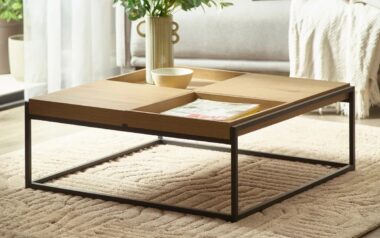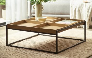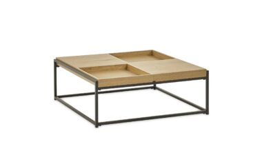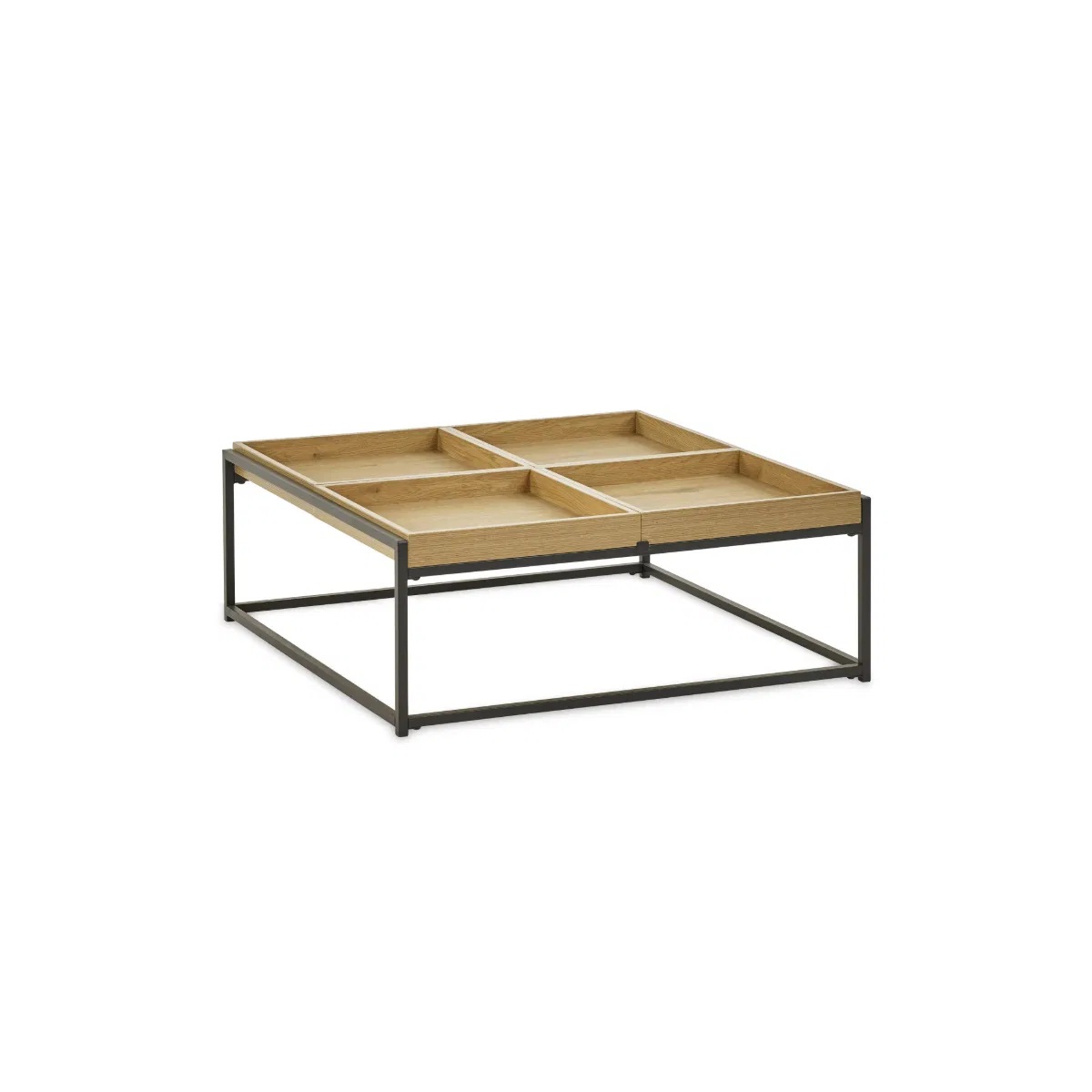 • Add style and functionality to your living room space with this contemporary square tray coffee table. Finished in warm light oak effect, it features four removable tray-top covers. It features four removable tray-top covers. Each tray can be used flat as a standard coffee table surface, flipped to create a raised-edge tray, or lifted away completely to double as a serving tray for drinks, snacks, or even breakfast on the sofa. The slim black metal legs provide sturdy support while adding a sleek, modern contrast to the natural wood tones.