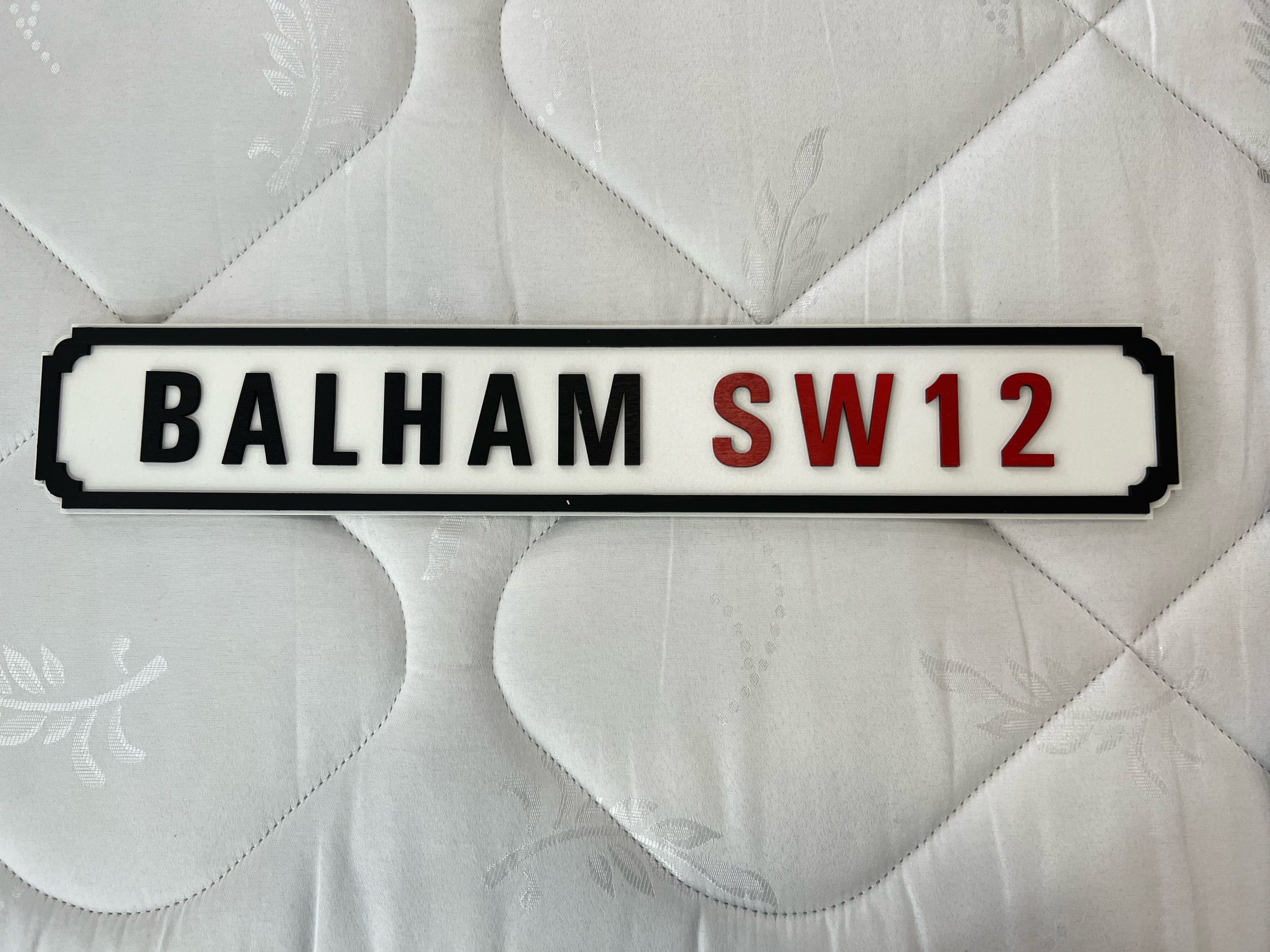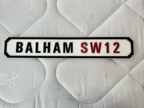 • A beautiful and original handcrafted location sign “Balham SW12” made from cedar wood