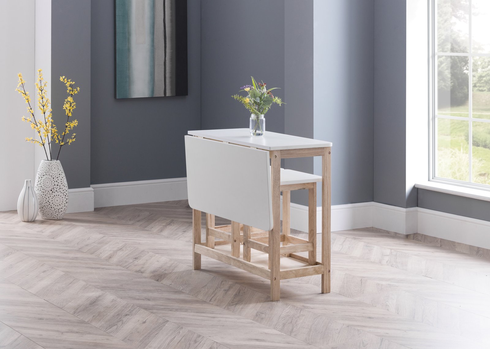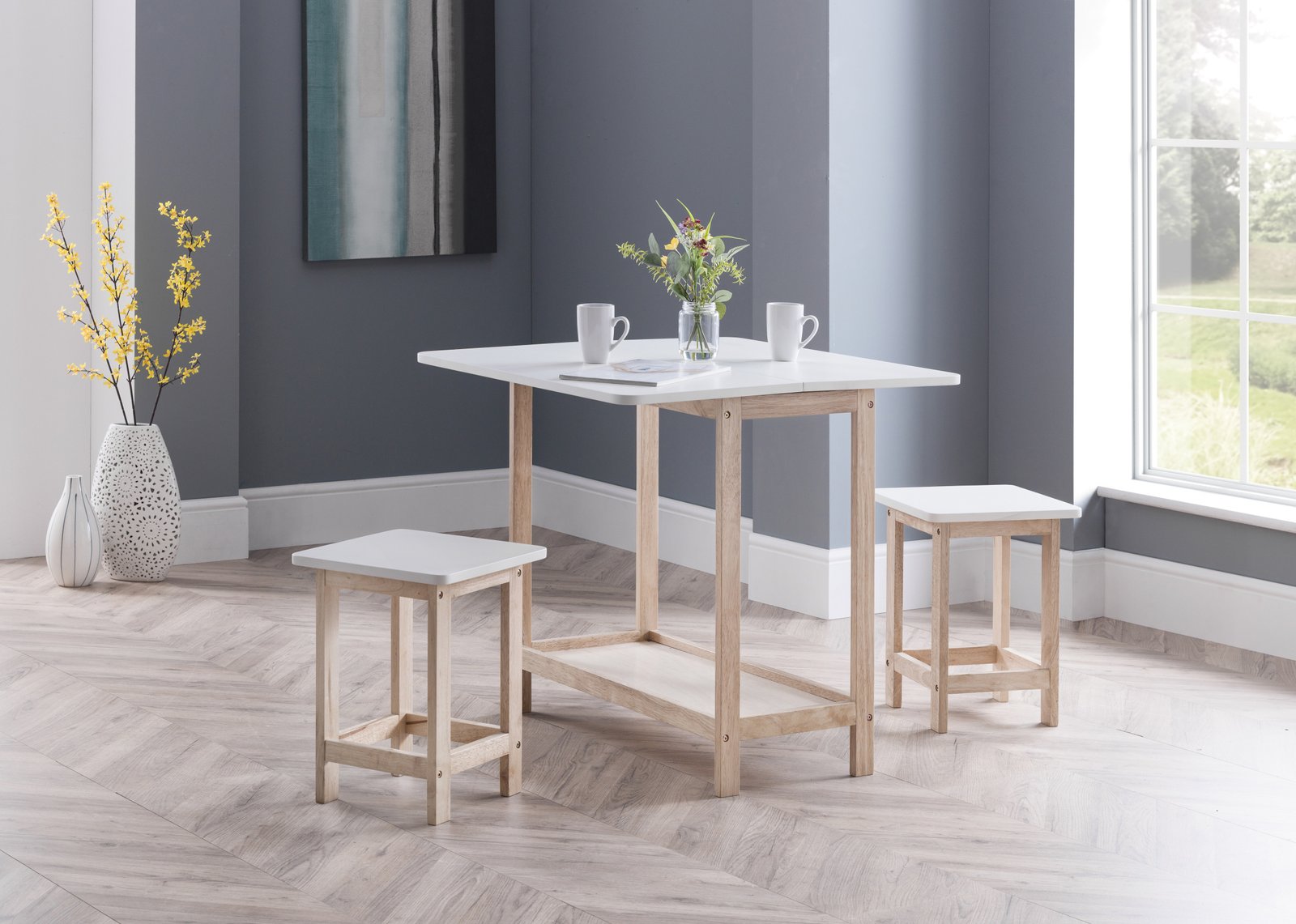 - The Belgium Bar set is ideal for smaller kitchen and dining areas with limited space. The two stools sit neatly on the bottom shelf, whilst the table top is fixed on wooden runners allowing the top to slide toward you and fold down. This space saving design means the dining set can be stored out of the way at ease when not in use. The two-tone combination of white and natural creates a mixture of modern and country style, perfect for a wide range of dƩcor.