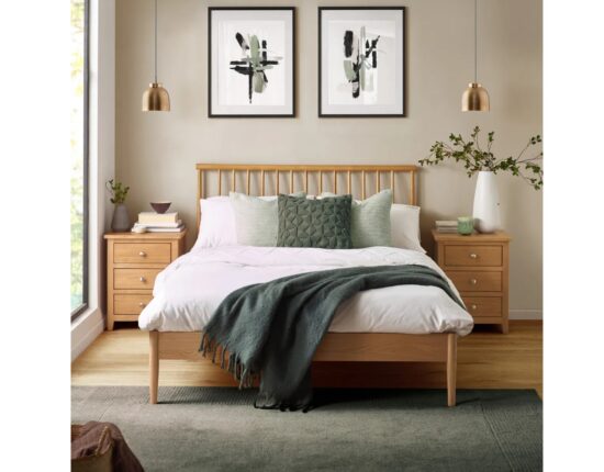 - Experience effortless style with this oak spindle bed. The gently slanted spindles give the headboard a light, airy feel, while the rich, solid oak frame adds warmth and character. Its minimalist design and tapered legs make it a versatile choice that suits both modern and classic interiors. The sturdy slatted base provides excellent mattress support, making this bed as practical as it is eye-catching.