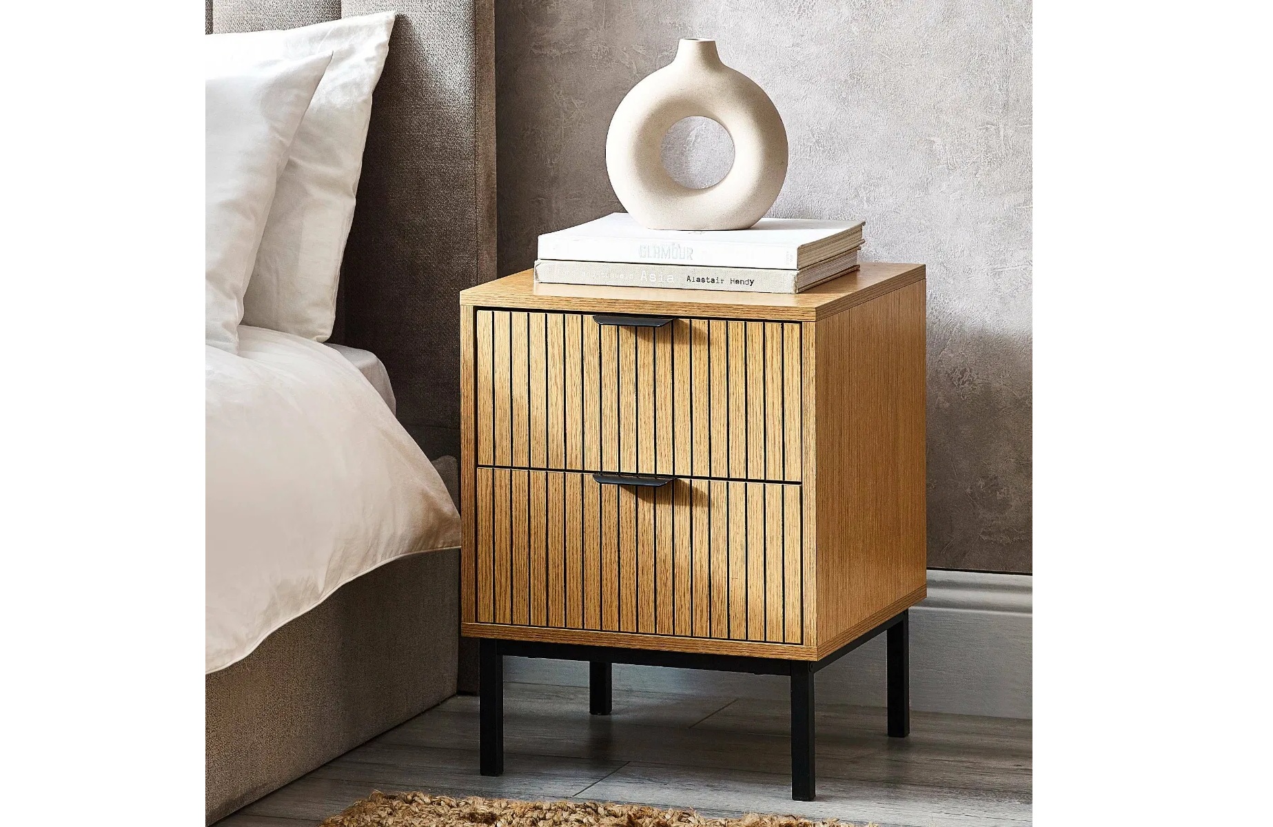 - This elegant piece features a vertical slat effect on the drawer fronts that add a sophisticated touch, while the compact design fits seamlessly beside your bed.