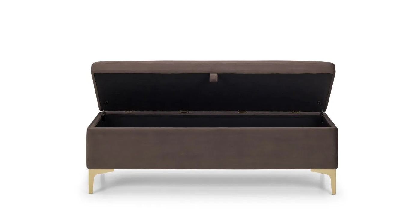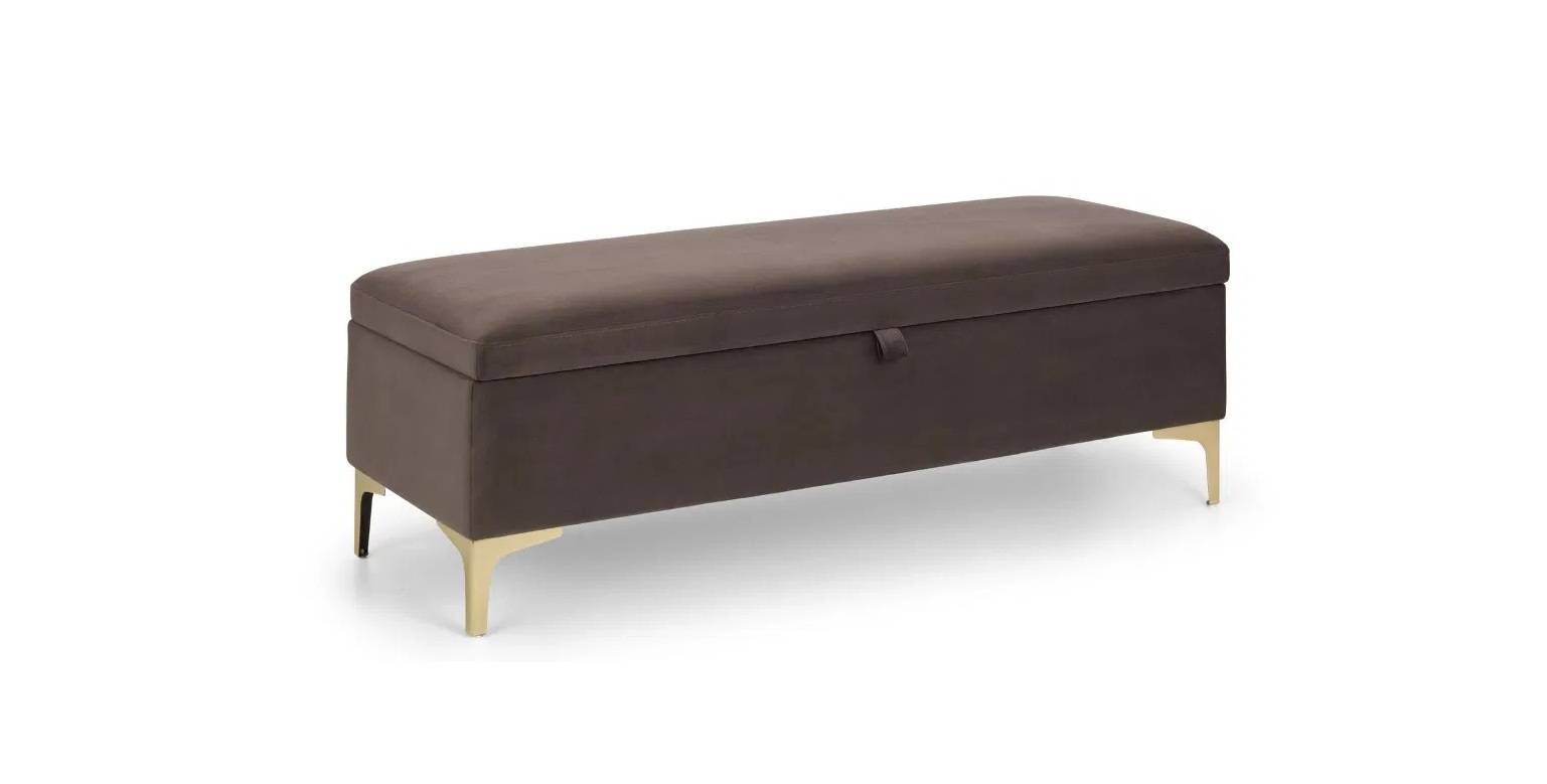 - Perfectly proportioned to sit at the end of a bed, this contemporary Decal blanket box is upholstered in a truffle velvet fabric with complimentary gold metal legs.