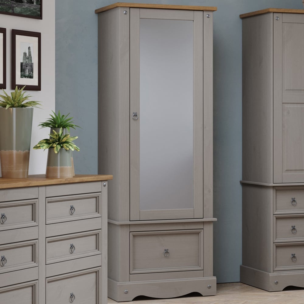 - Features a 1 drawer, 1 door design that is manufactured from Solid Pine in a grey wash effect and also completed with a beautiful grey washed wax finish, internal hanging and mirrored door. This Armoire offers a medium storage solution for your home and is manufactured to suit any setting whilst combining strength with reliability.