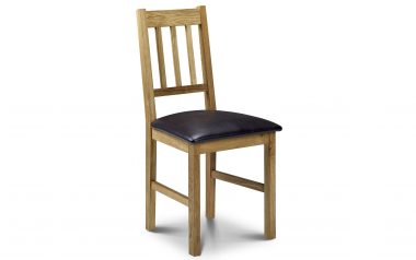 Solid White Oak Dining Chairs in a durable oiled finish and featuring a padded brown faux leather seat.
