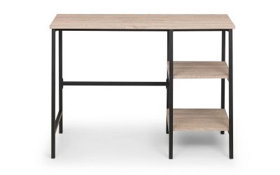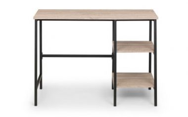 - A cool, modern desk designed to add a contemporary touch to any living space. Its simple clean lines, delineated by a subtle, black coated metal frame are complemented perfectly by a beautiful walnut to create a very stylish and sleek product. This desk features 2 shelves on the right hand side, suitable for stationary storage.
