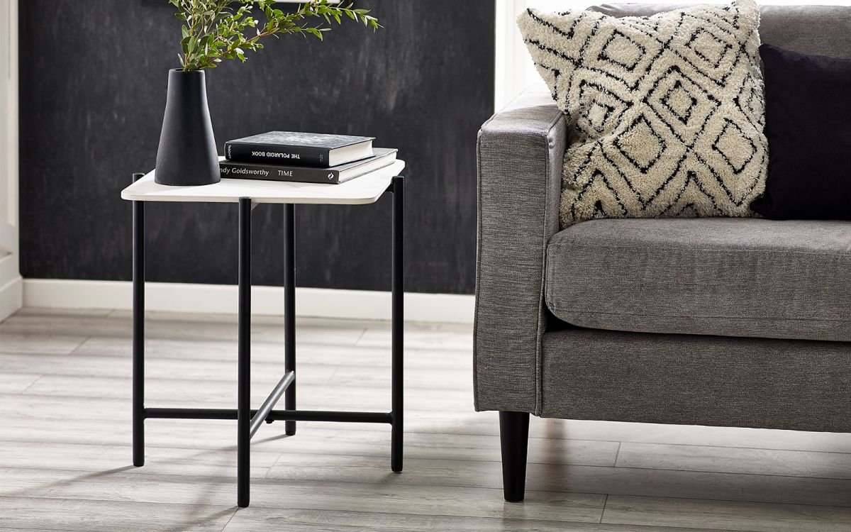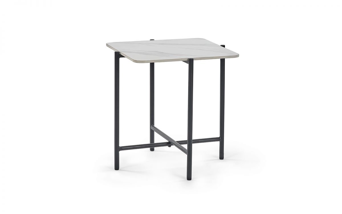 • Featuring a white marble sintered stone square top sat on a black metak base.