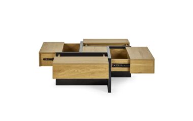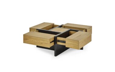 - Designed to impress with a touch of geometric flair, this modern coffee table offers sharp lines and smart storage, with a beautiful, warm oak-effect finish. The smooth sliding top reveals four hidden compartments, each offering a discreet spot to keep everyday essentials close at hand but neatly out of sight. Once closed, the surface forms a seamless square desktop, ideal for displaying dƩcor, holding drinks, or simply enjoying a clutter-free look. Balanced on a striking black cross-style base, it adds a contemporary edge while ensuring support.